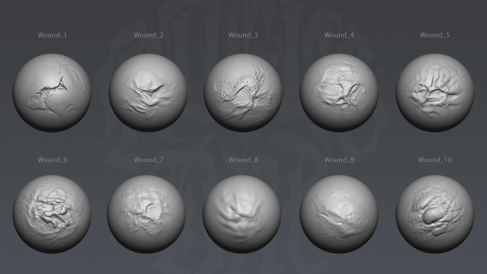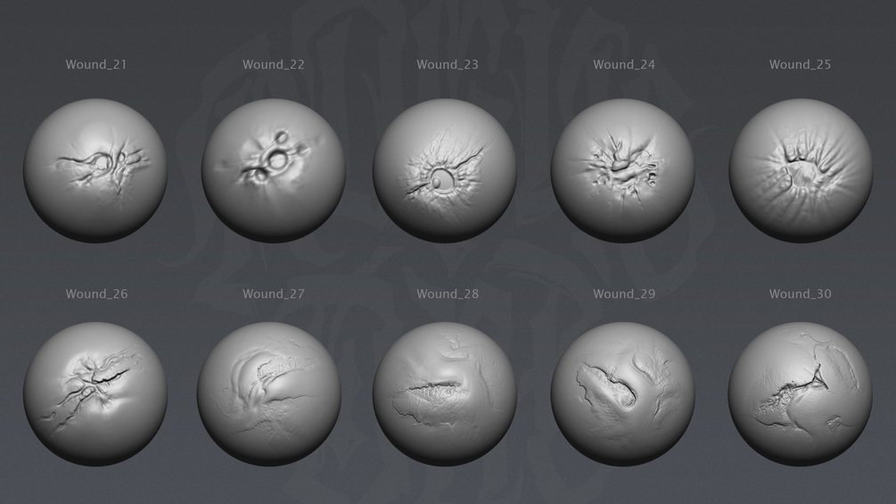 30 handmade wound brushes and alphas to use in ZBrush to create base detail on your models, which can then be further refined and polished by hand.